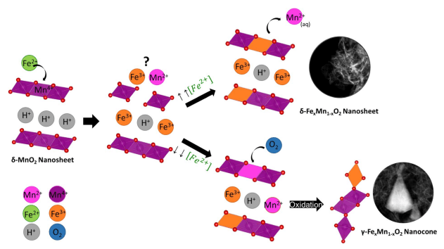 Mechanism of coupled phase/morphology transformation of 2D manganese oxides through Fe galvanic excehang reaction