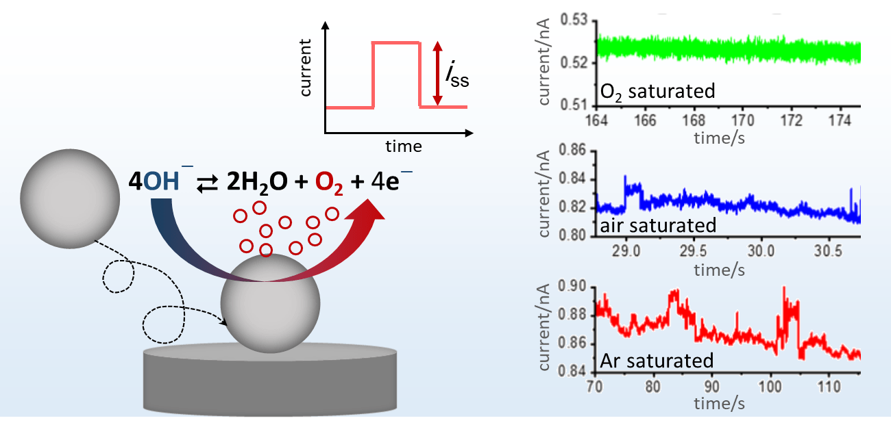 During its contact at the electrode, the “wired” nanoparticle can act as a nanoelectrode and catalyze a redox reaction. Due to the highly efficient mass transport at the nanoscale, extremely high current densities can be obtained. This provides an efficient route to gain insights into the catalytic properties of a (new) nanomaterial, including both intrinsic reaction mechanism and kinetics. For example, nano impact studies on the oxygen evolution reaction (OER) at ca. 4 nm sized CoFe2O4 spinel nanoparticles result characteristic, potential-dependent current steps.[1] At high overpotentials, the step height is directly proportional to the distribution of the particle size and O2 (product) concentration in the solution, revealing that diffusion of produced O2 away from the catalyst surface is the limiting factor. Accordingly, nano impact studies in Ar saturated electrolyte show distinct signals in the presence of the catalyst, while current steps recorded in air are smaller than those recorded in the absence of O2 in the electrolyte and no current step can be observed in O2 saturated electrolyte.