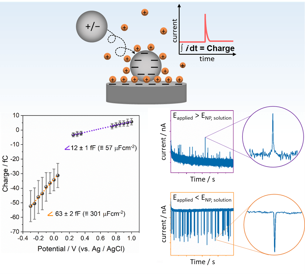 During nano impact events, the EDL of the colliding nanoparticle is perturbed. The resulting (dis)charging process gives rise to a transient current-time event (called blip or spike) that can be analyzed to gain direct insights into the electronic properties of the impacting particle. As the EDL rearrangement is measured while the collision occurs, information on colloidal nanoparticles can be obtained (e. g. their potential in solution), instead of being limited to usual surface-immobilized nanoparticles. Capacitive impacts of platinum NPs reveals an EDL capacitance much higher than that predicted by classical EDL models, which omit the influence of metal-water interactions.[2] Such interactions can lead to ion accumulation and water chemisorption at the metal surface providing a much higher charge storage ability at the interface.