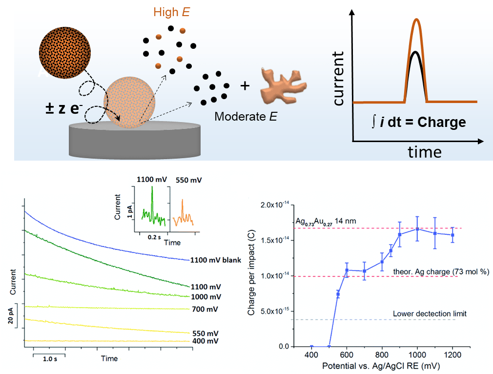 By electron transfer between the colliding NP and a suitably polarized electrode, oxidation or reduction of the colliding particle can occur. The electrochemical conversion of individual nanoparticles results in transient current responses revealing their physical properties, e.g., size, composition, structural arrangement (core-shell vs. alloy), agglomeration state, and/or their concentration and the associated electrode kinetics. For instance, bimetallic NPs can be characterized to extract information about particle size and the ratio of the two components. By comparing the electrical charge of current peaks at different applied potentials, we are able to derive the size and the component ratio of the bimetallic NP. At a moderate potential, only the less-noble component of the NP is oxidized, while, both components of the NP react at high potentials. The ratio of both peak charges reveals the content of the less noble component. For instance, nano impact analysis on 14 nm sized Ag0.73Au0.27 alloy nanoparticles at different potentials were shown to yield the size and composition of individual NPs.[4] This approach is expected to give valuable insights into particle-to-particle differences in electrochemical dealloying, which is a great tool to improve the catalytic activity of NPs by providing the desired porosity and composition.